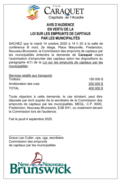 AVIS D’AUDIENCE EN VERTU DE LA LOI SUR LES EMPRUNTS DE CAPITAUX PAR LES MUNICIPALITÉS